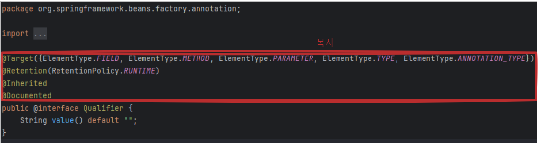순서2. @Qualifier를 Annotation으로 만들 것이기 때문에 @Qualifier에 들어가서 위에 부분을 복사해온다.