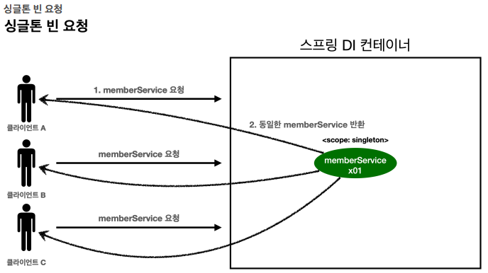 이것은 스프링 빈이 기본적으로 "싱글톤" 스코프로 생성되기 때문이다.