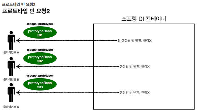 클라이언트에 빈을 반환하고, 이후 스프링 컨테이너는 생성된 프로토타입 빈을 관리하지 않는다.