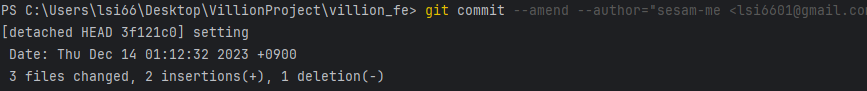 git commit --amend --author="sesam-me <lsi6601@gmail.com>" // 3번째 변경