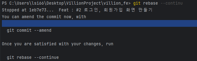 git rebase --continue // 1번째꺼 마무리. 커밋의 개수만큼 하면 됨..