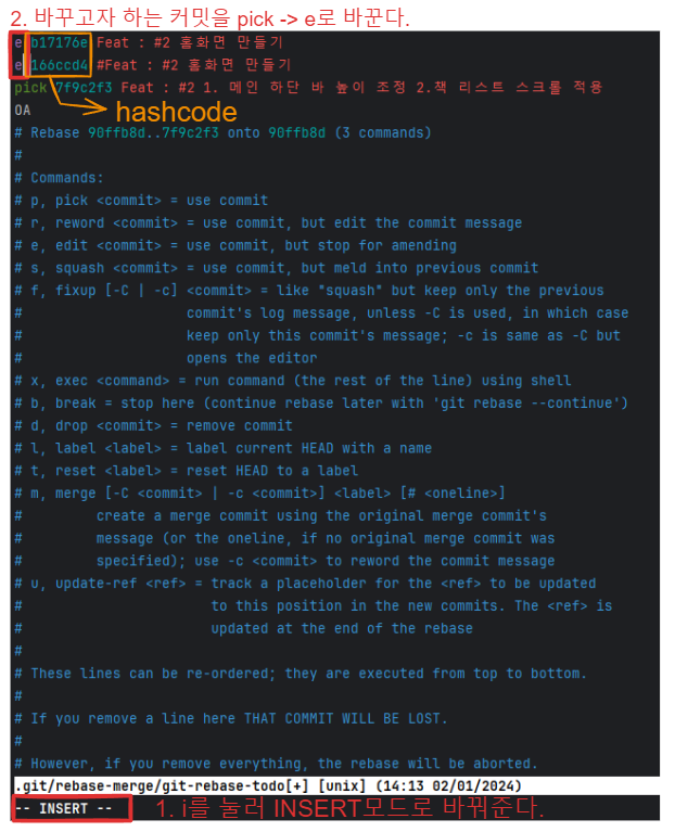 순서 2) git log에서 보았던 해시코드 앞자리 7자리와 동일한 것을 확인 후, 바꾸고자 하는 커밋 pick → e로 바꾼다.