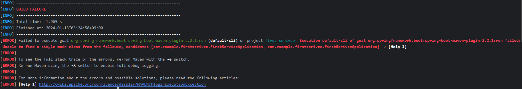 Execution default-cli of goal org.springframework.boot:spring-boot-maven-plugin:3.2.1:run failed: Unable to find a single main class from the following candidates [com.example.firstserivce.FirstServiceApplication, com.example.firstserivce.FirstSerivceApplication] -> [Help 1]