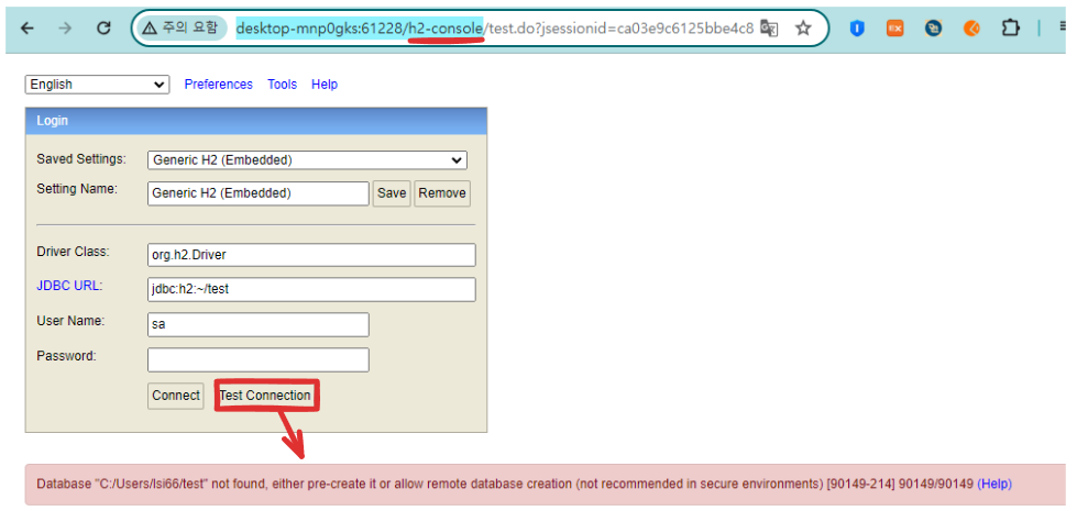 위 상태에서 Test Connection 버튼을 클릭하면 mem:testdb를 찾을 수 없다는 에러가 발생한다.