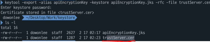 keytool -export -alias apiEncryptionKey -keystore apiEncryptionKey.jks -rfc -file trustServer.cer