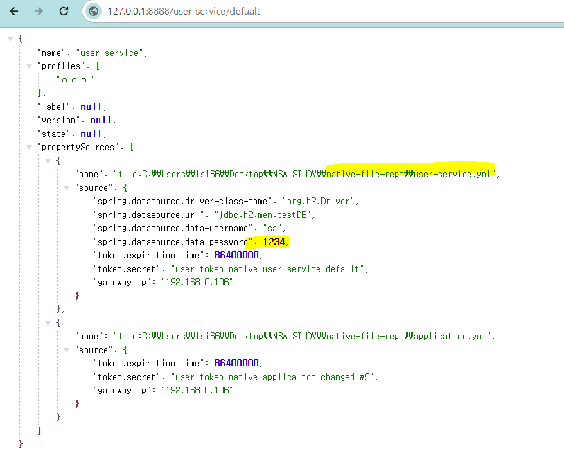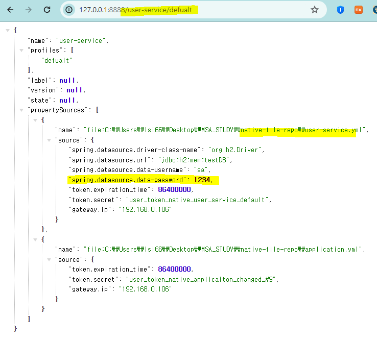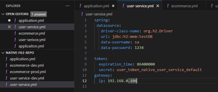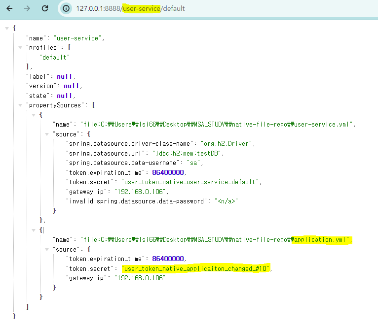 User Microservice의 application.yml, bootstratp.yml을 수정 -> Config Server의 native-file-repo폴더의 user-service.yml로 이동