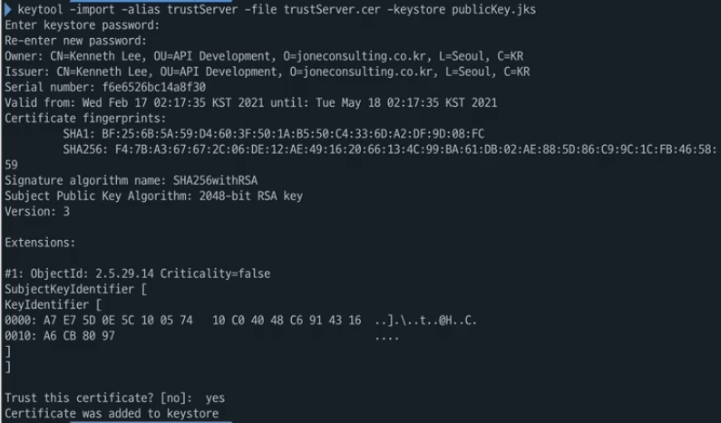 keytool -import -alias trustServer -file trustServer.cer -keystore publicKey.jks
