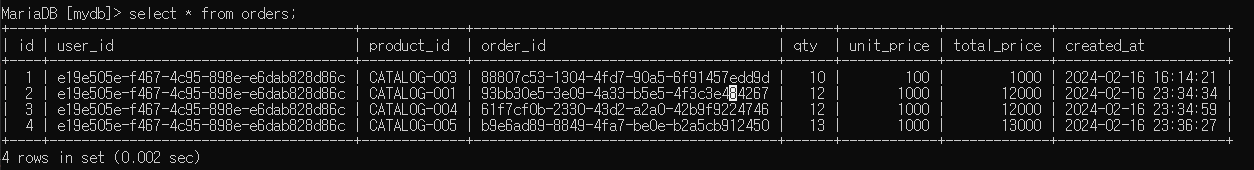 주문한게 모두 한 orders 테이블에 들어가 있는 것을 확인할 수 있다.