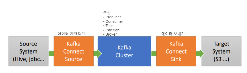 구성 요소: Source Connector(데이터를 Kafka로 가져오는), Sink Connector(데이터를 Kafka에서 다른 시스템으로 보내는)로 구성됩니다.