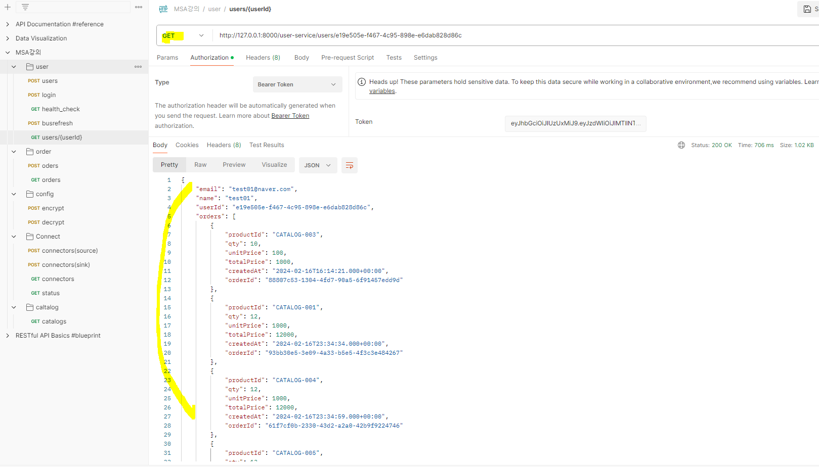 Orders Service에서 주문을 하면 User Serivce에 반영이 되는지 테스트해보자.