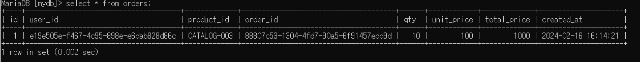 mariaDB로 변경이 잘 되어 order가 들어간 것을 확인할 수 있다.