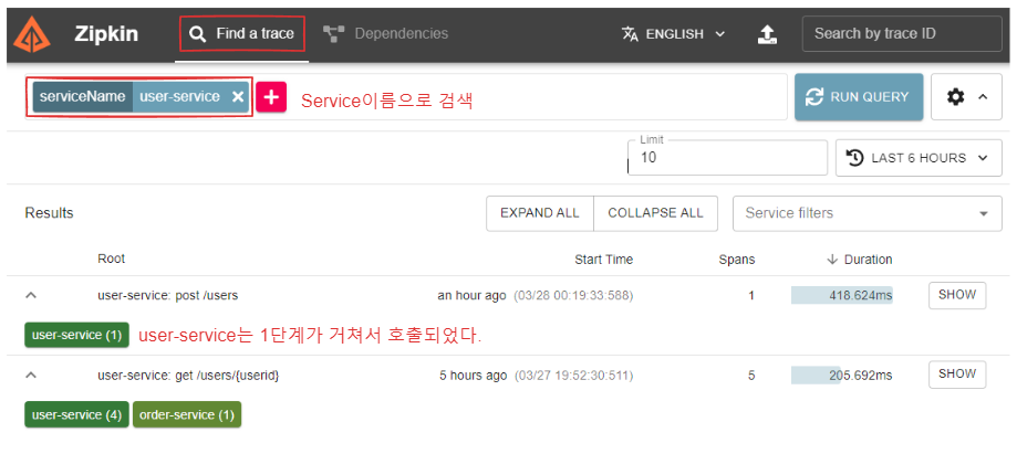 Zipkin server์์ ํ์ธํด๋ณด์(port : 9411)