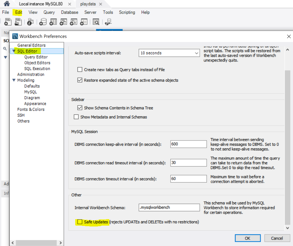 SQL에는 사용자가 실수로 데이터를 삭제하는 것을 방지하기 위해 safe mode가 디폴트로 설정되어있다.