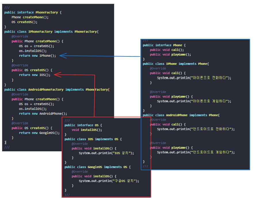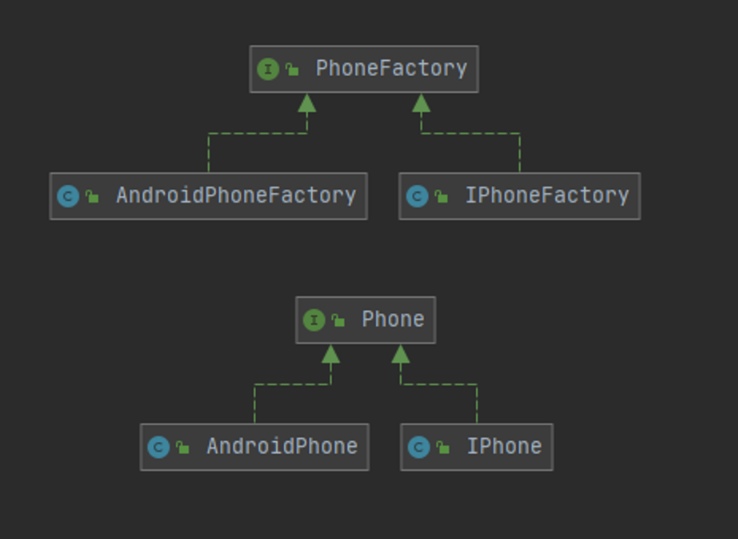 먼저 위에서 본 메소드 팩토리 패턴에서는 PhoneFactory의 구현체 IPhoneFactory, AndroidPhoneFactory가 각각 IPhone객체 AndroidPhone객체 하나씩을 생성하게끔 작성했다.