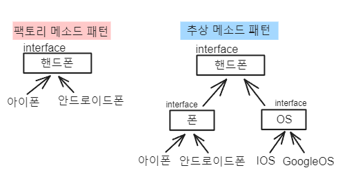 심플 팩토리 패턴에서 createPhone() 부분에서 Factory에서 직접 객체를 만드는 것을 Factory를 상속한 서브클래스에서 객체를 만들게끔 하는 것이 팩토리 메소드 패턴이다.