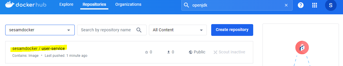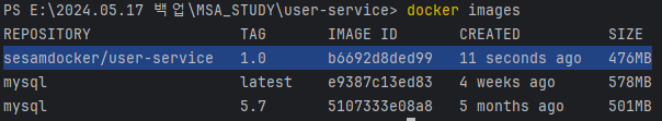 이미지를 확인해보면 sesamdocker/user-service가 새로 생긴 것을 확인 할 수 있다.