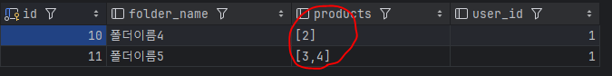 아래처럼 1행에 1개의 상품을 넣는 것이 아니라, 배열을 만들어 찜 상품을 추가할 때는 product_id 필드만 수정하면 되는 방향으로 해보려고 한다.