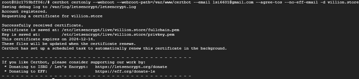 certbot certonly --webroot --webroot-path=/var/www/certbot --email lsi6601@gmail.com --agree-tos --no-eff-email -d villion.store