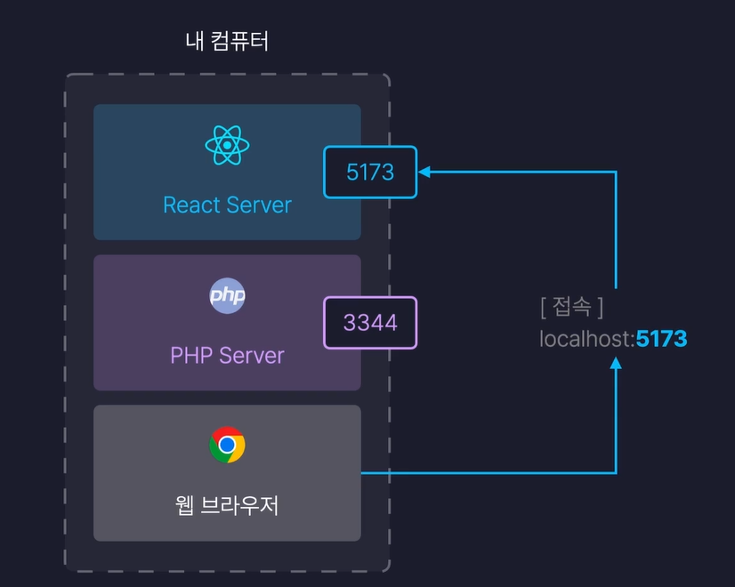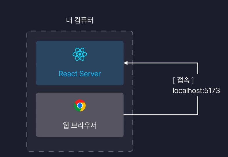 localhost:5173 주소로 접속한다는 것은 브라우저에서 내 컴퓨터에서 실행되고 있는 리액트 웹서버에 접속 요청을 보낸다라고 이해하면 된다.