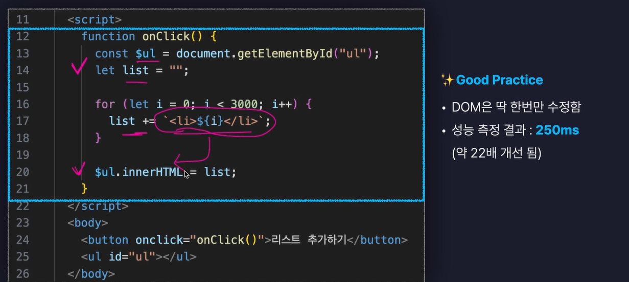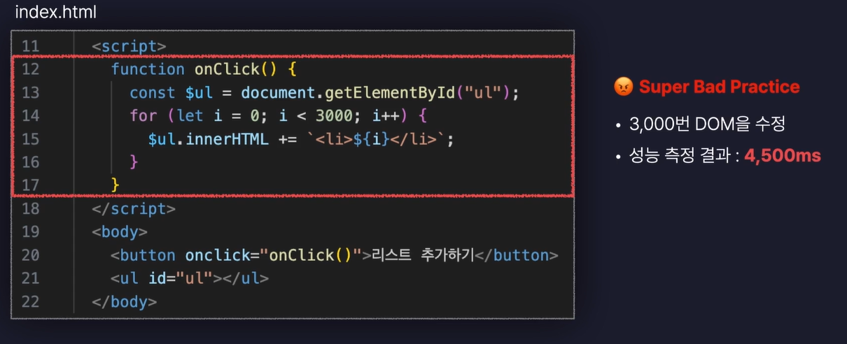 만약 DOM을 3000번 수정하게 된다면 렌더트리 이후 과정을 3000번 다시 진행하게 되면서 성능이 악화되고 브라우저에서 응답없음 페이지를 띄워버리면서 아예 마비가 될 수도 있다.