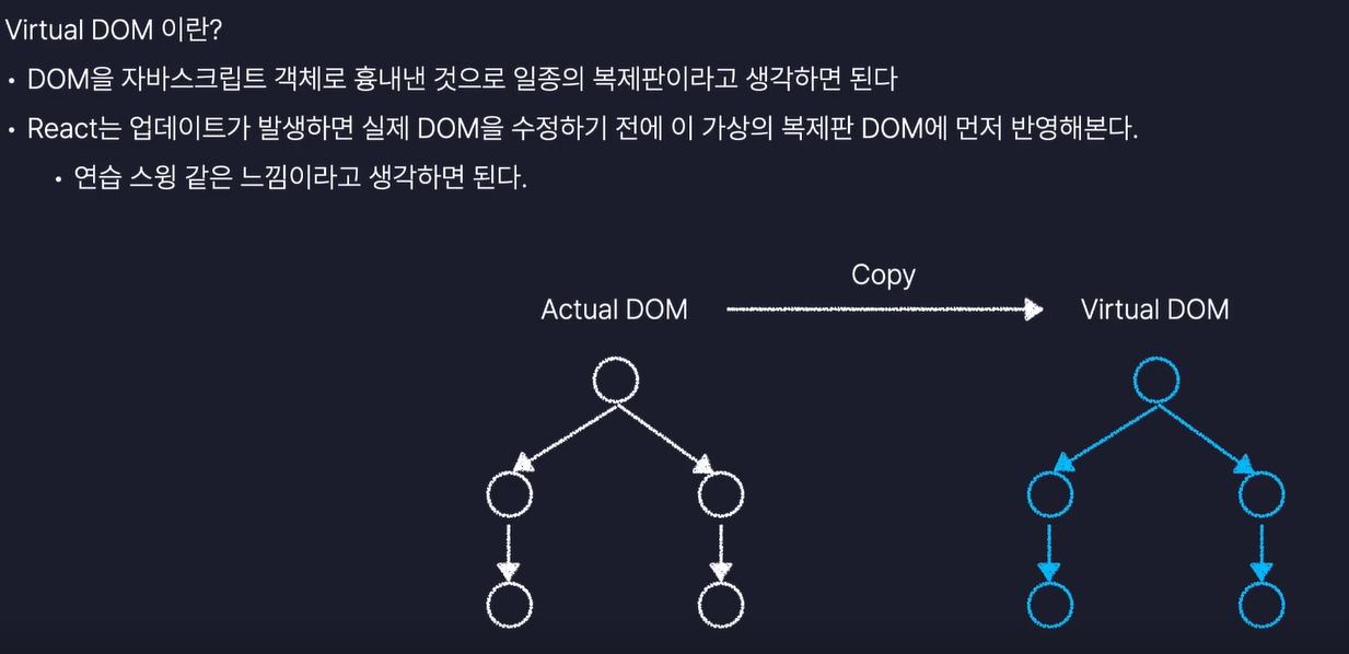 내부적으로 가상 DOM이라는 가상의 DOM을 이용하기 있기 때문에 가능하다.(Virtual DOM)