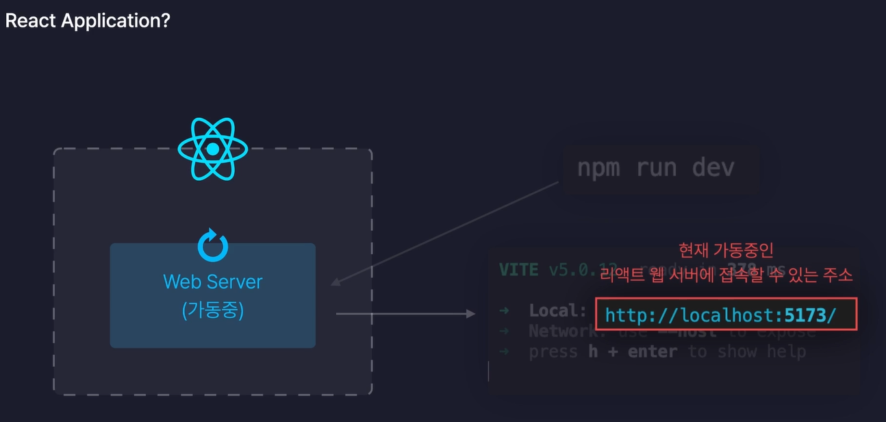 Vite를 통해 생성한 React App은 Web Server가 내장되어 있었고 React App을 가동하기 위해 사용했던 npm run dev라는 명령어는 React Web Server를 가동시키는 명령이였던 것이다.