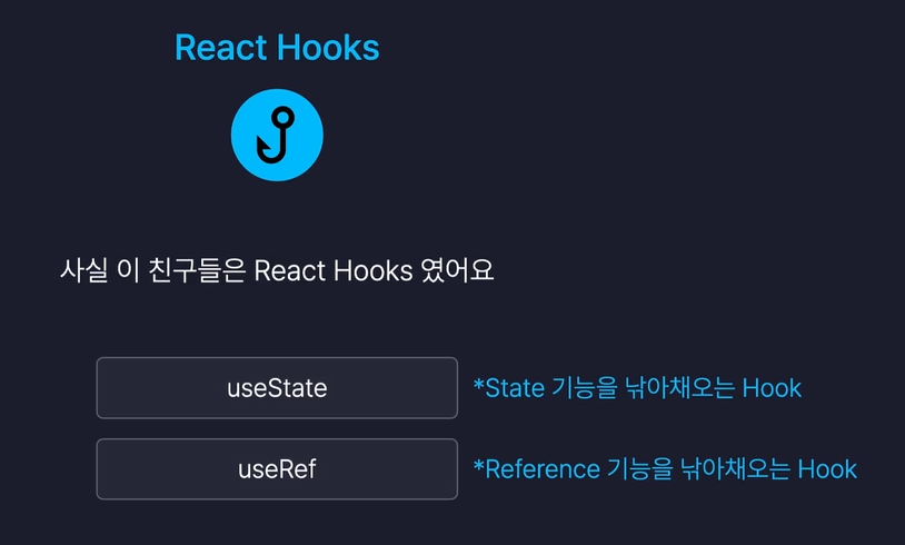 함수 컴포넌트에서도 클래스 컴포넌트의 기능을 마치 낚아채듯이 가져와서 사용할 수 있게 해주는 React Hooks기능을 개발.
