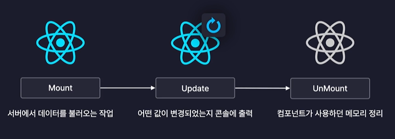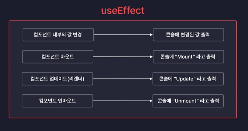 그래서 결록적으로 useEffect를 사용하면 이런 라이프 사이클을 제어할 수 있다.(Mount, Update, Unmount 때 특정 코드를 실행시키는 것을 만들 수 있다.)