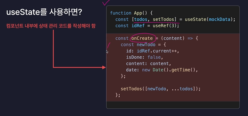 todos처럼 배열 안에 객체가 들어가는 복잡한 구조는 보통 useReducer를 이용해서 관리하는게 일반적이다.