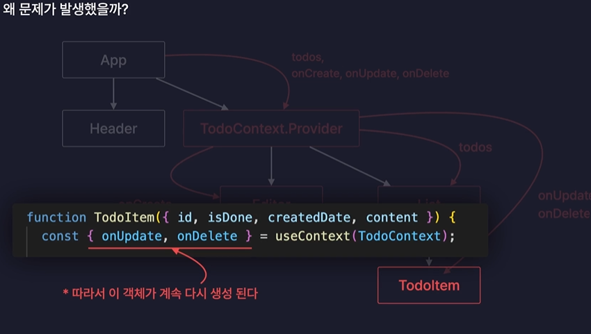 Provider도 엄연히 React의 컴포넌트이기 때문에, 앱컴포넌트로부터 value props로 제공받는 todostate와 onCreate, onUpdate, onDelete를 감싸고 있는 객체가 바뀌게 되면(props가 바뀌게 되면), 리렌더링이 발생하게 된다.