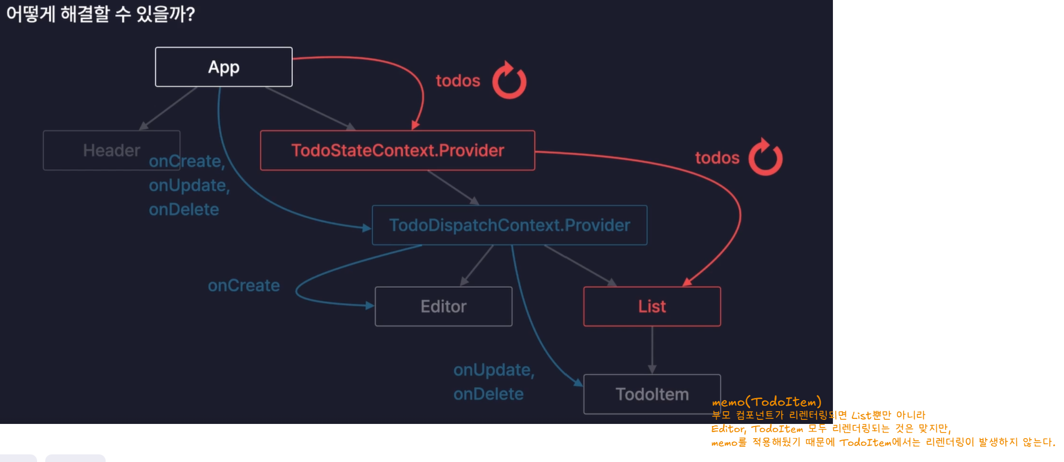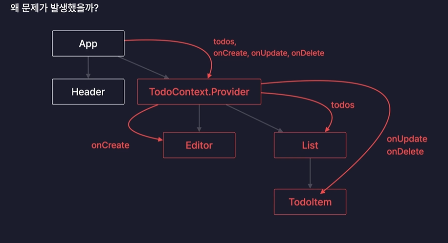 TodoContext.Provider가 리렌더링되면서 하위 객체인 Editor, List, TodoItem도 리렌더링 된다.