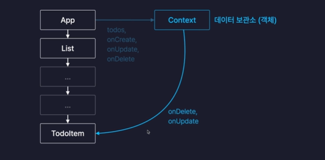 그래서 Context를 새롭게 생성한 다음에 App 컴퍼넌트에서 원래 자식 컴퍼넌트에세 전달되던 이 ToDos, OnCreate, Onupdate, OnDelete와 같은 함수들을 이 Context에 보관해 놓으면 Props를 이용하지 않고 다이렉트로 Context를 통해서 필요한 데이터를 공급할 수 있다.