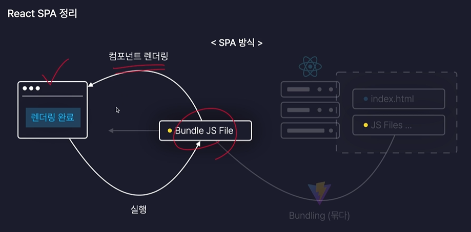 이 Bundle JS File은 직접 작성한 모든 리액트 컴포넌트들이 하나의 파일로 묶여있는 자바스크립트 파일이기 때문에 사실상 리액트 앱이라고 부를 수 있다.( Bundle JS File = React App)