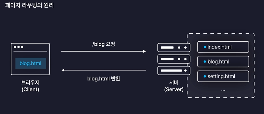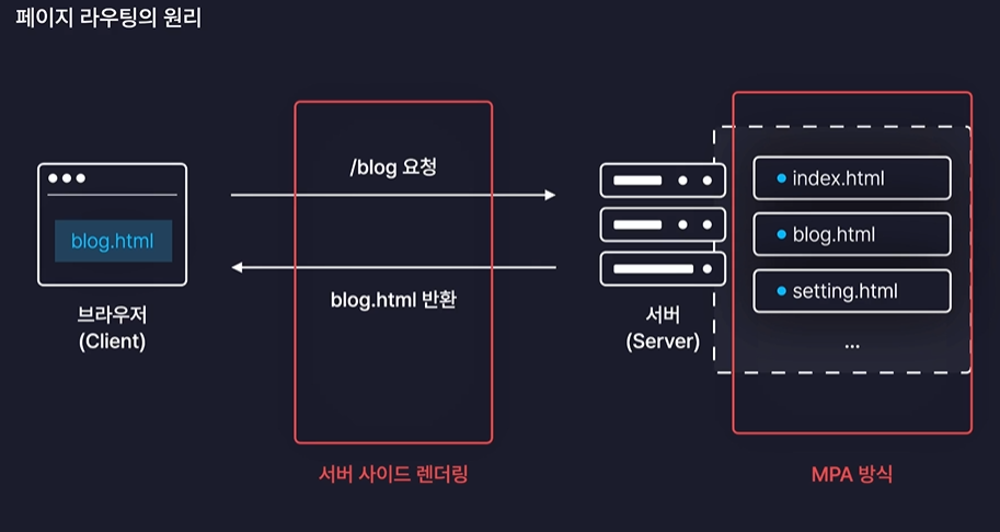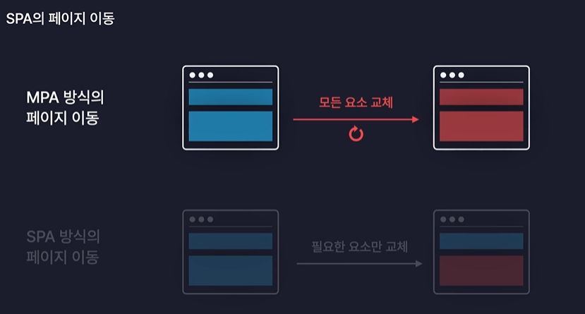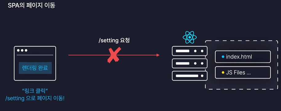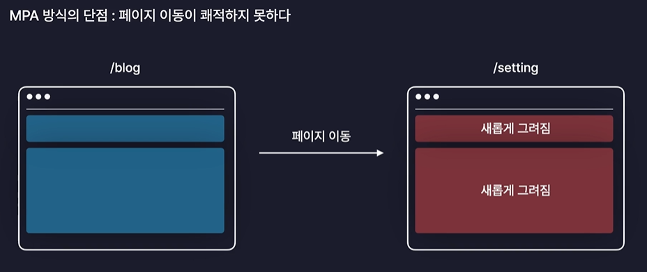 페이지를 이동할 때마다 새로운 페이지를 받아와서 화면을 처음부터 다시 렌더링 해준다.