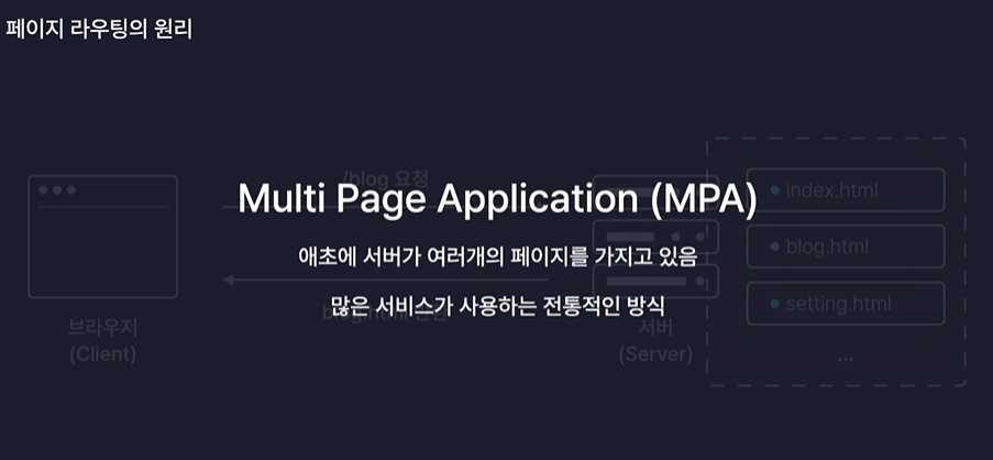 오른쪽처럼 서버가 여러 개의 HTML페이지를 가지고 있는걸 MPA 방식이라고 부른다.