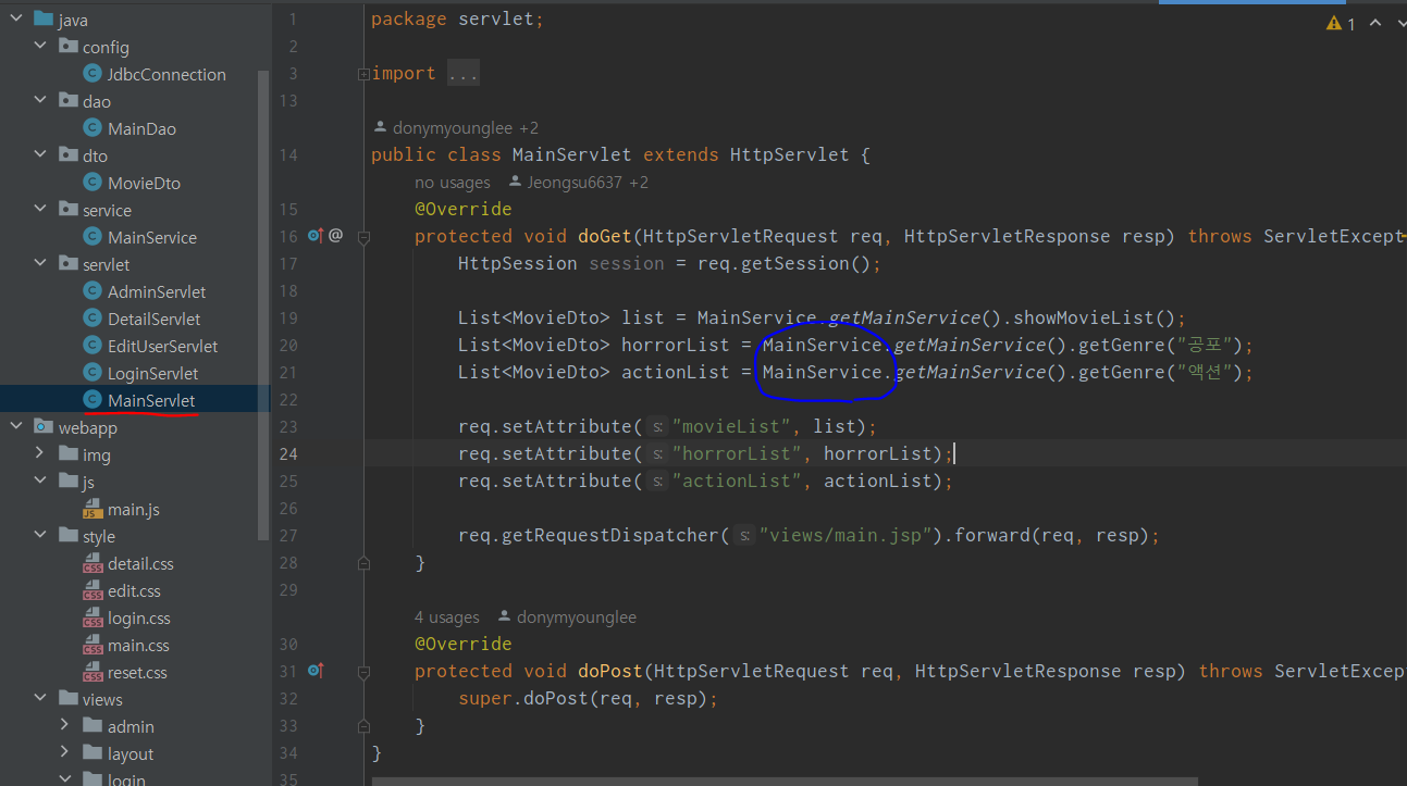 doGet에서 url로 검색해서 들어왔을 때는 req.getRequestDispatcher("views/main.jsp").forward(req, resp); 로 main화면 띄워주고, 요청받은 걸 list로 만듦!!