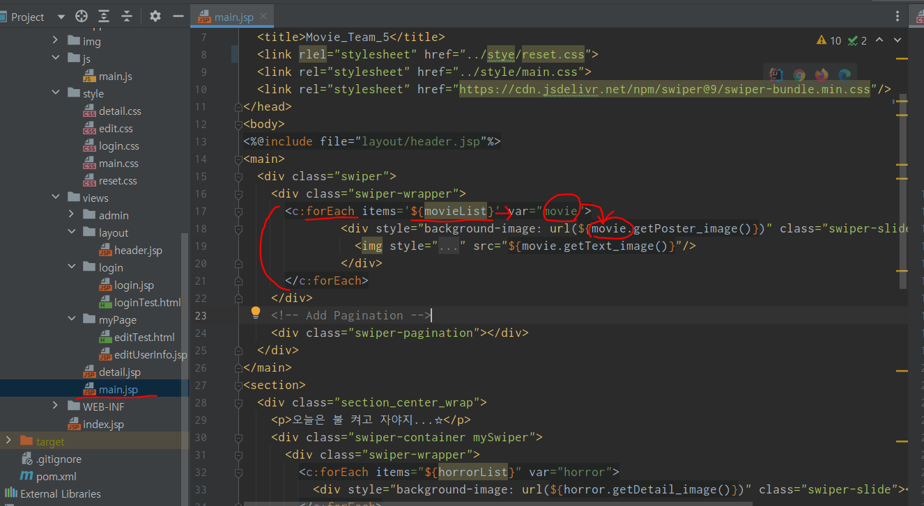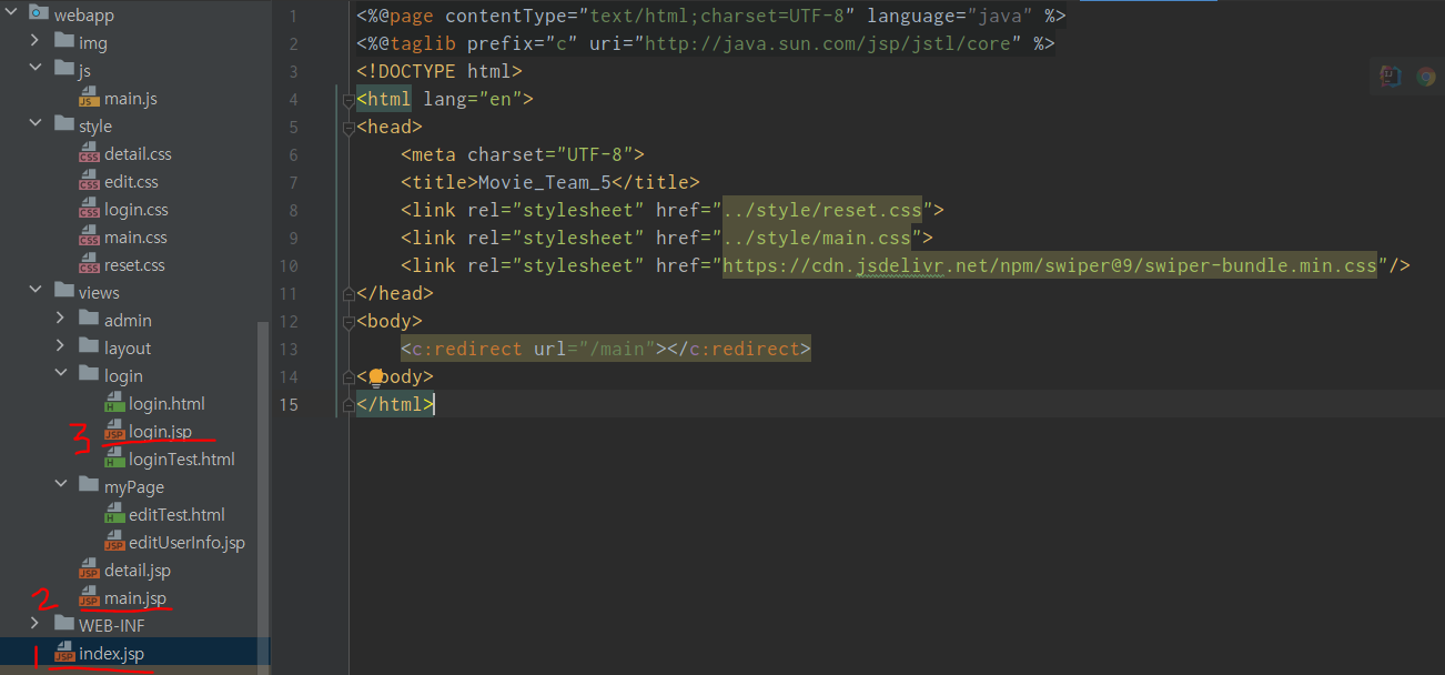 1. index.jsp : 서버 키자마자 열리는 곳 <c:redirect url="/main"></c:redirect>으로 main으로 보냄