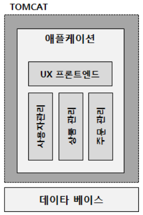 예를 들어, 온라인 쇼핑몰 애플리케이션이 있을때, 톰캣 서버에서 도는 WAR 파일(웹 애플리케이션 패키징 파일)내에, 사용자 관리,상품,주문 관리 모든 컴포넌트들이 들어 있고 이를 처리하는 UX 로직까지 하나로 포장되서 들어가 있는 구조이다.