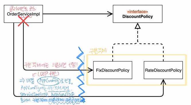 ** DIP위반 : MemoryMemberRepository(), FixDiscountPolicy() 구현 클래스에도 의존하고 있다.