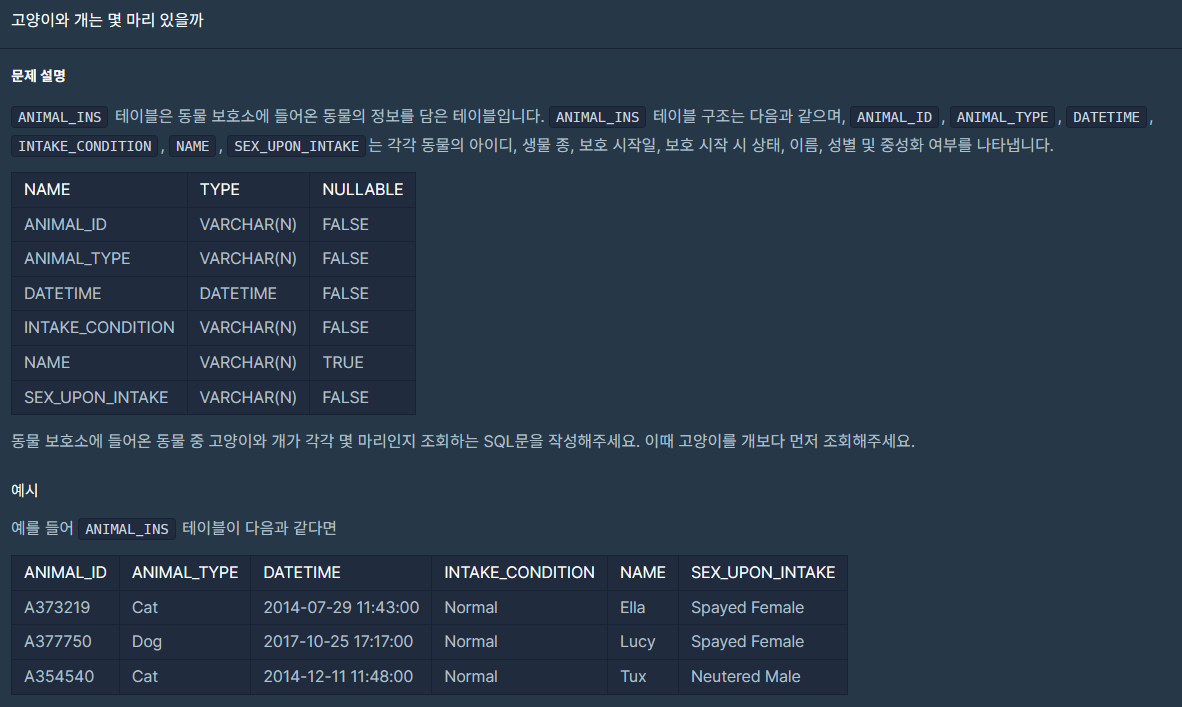 📌#1 SELECT ANIMAL_TYPE, COUNT(ANIMAL_TYPE) AS count