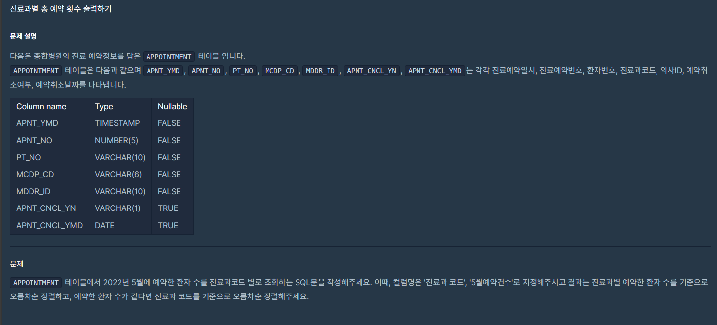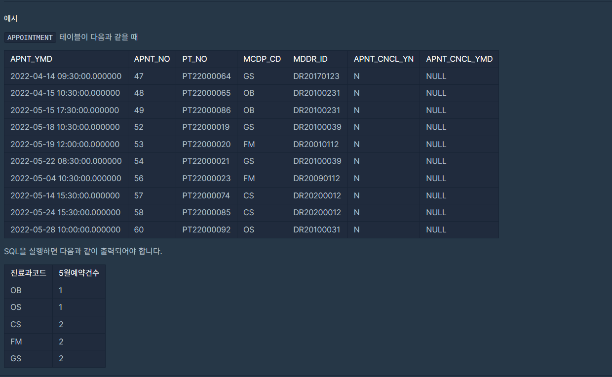 📌 #1 SELECT MCDP_CD AS '진료과코드', COUNT(*) AS '5월 예약건수'