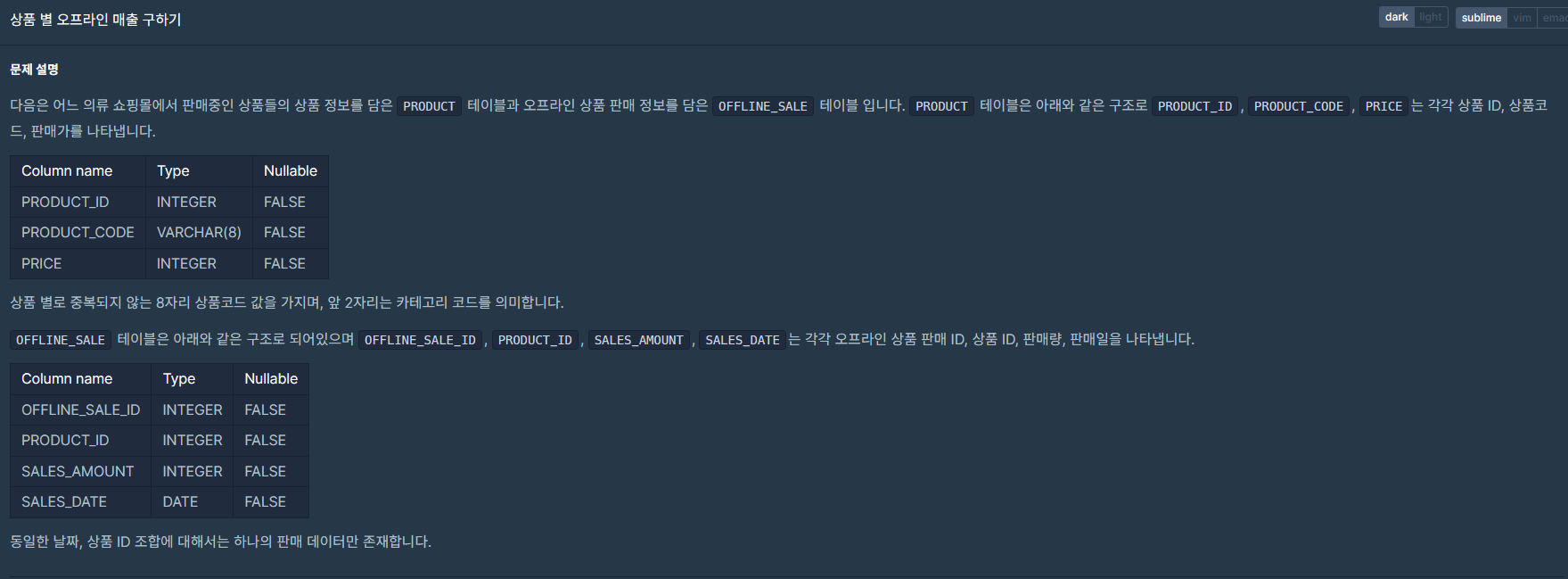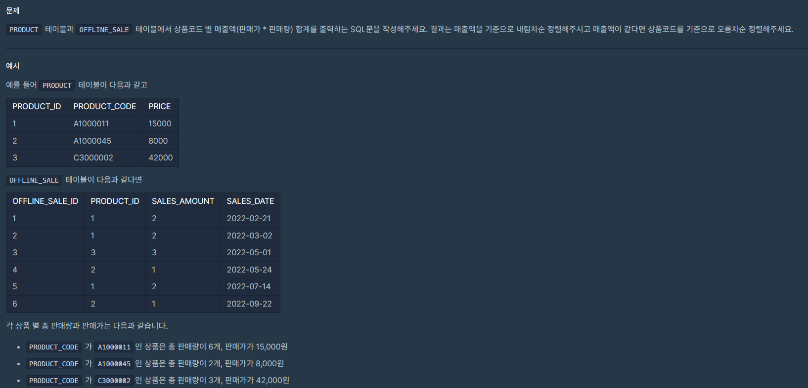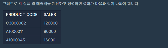 📌 ORDER BY SALES DESC, PRODUCT_CODE ASC;