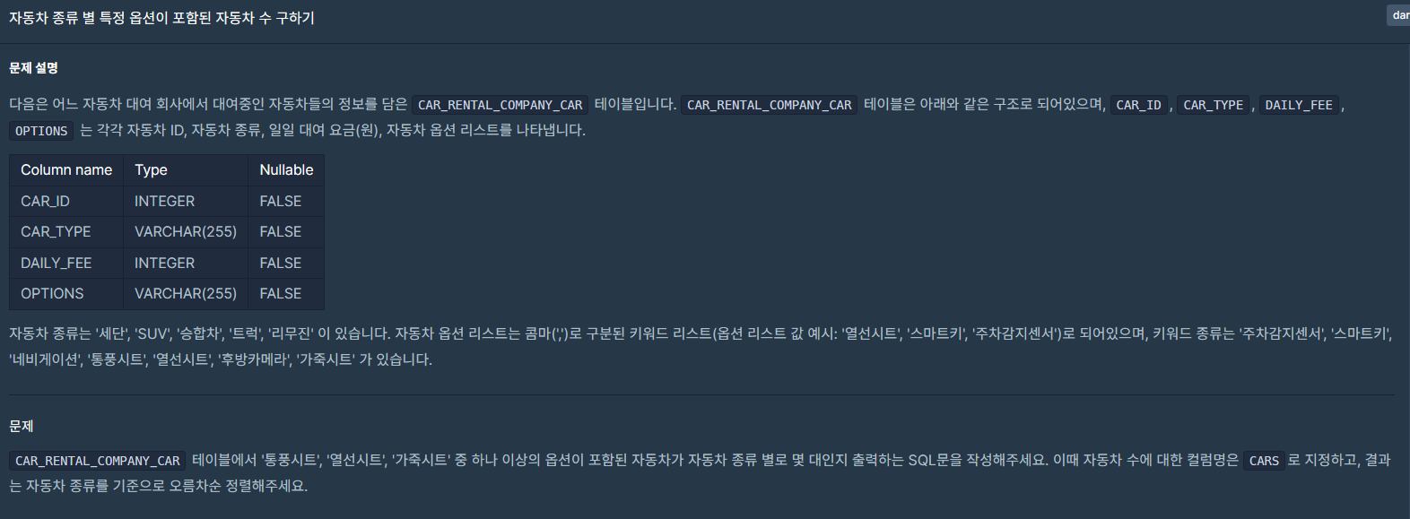 ※ WHERE OPTIONS IN ('통풍시트', '열선시트', '가죽시트')가 오답인 이유
