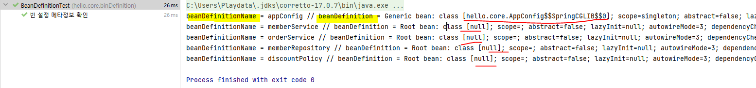 어노테이션활용한 자바코드로 실행했을 때는 bean에 대한 class 경로가 null인 것을 확인할 수 있다.