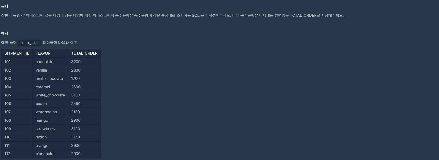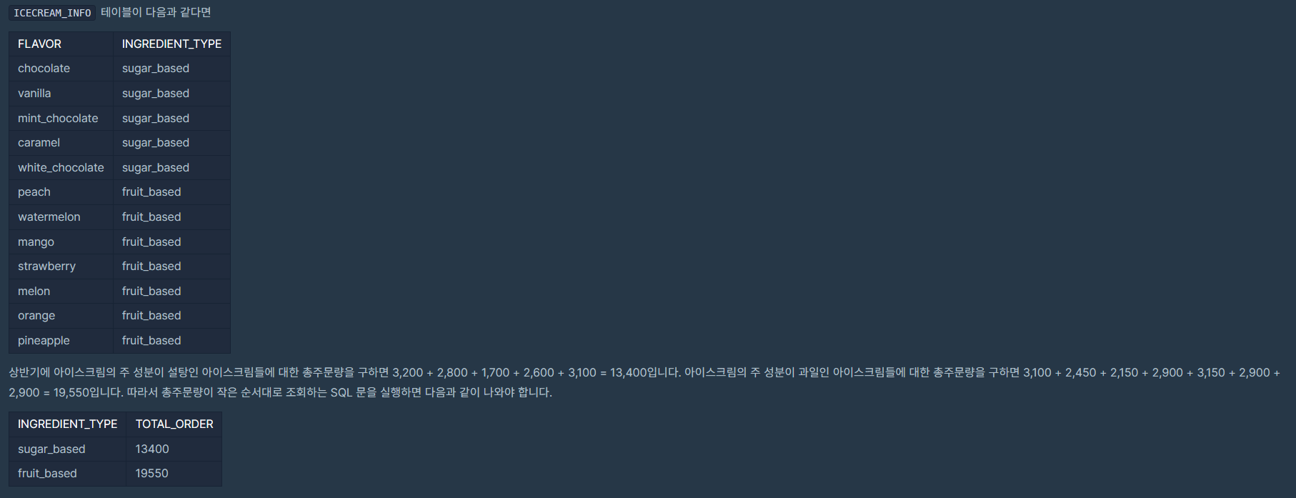 📌 SELECT INGREDIENT_TYPE, SUM(TOTAL_ORDER)